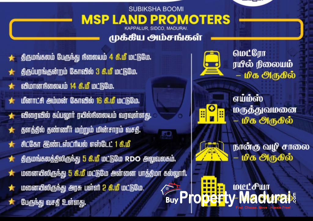 Swarna Boomi is strategically located in one of the fastest-growing prime areas near Kappalur SIPCOT, just 800 meters from the Thoppur–Tirumangalam 4-way track. This region is witnessing rapid development with prestigious projects like AIMS, Thoppur Satellite City, Metro Projects, and more already taking shape.